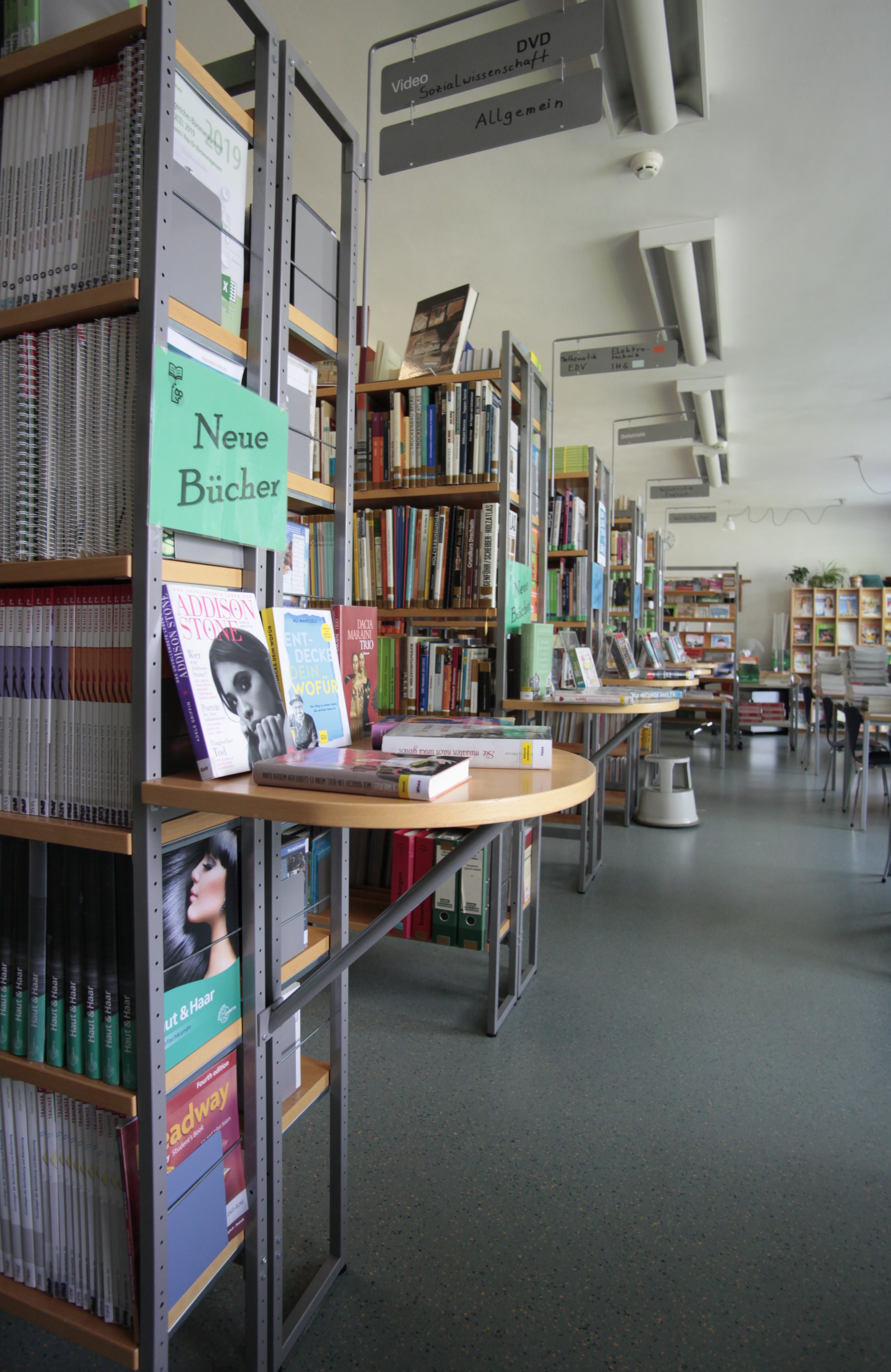 Unsere Bibliothek richtet sich nach den Bedürfnissen der Schüler und Schülerinnen und Lehrerpersonen, berücksichtigt aber in ihrem Medienbestand auch die unterschiedlichen Berufsfelder und Fachgebiete einer Berufsschule. Dies sind die Bereiche Elektrotechnik, Holztechnik, Handel und Verwaltung, Installateure für hydraulische und sanitäre Anlagen, KFZ-Mechanik, Metalltechnik, Bautechnik, Friseurtechnik, Schönheitspflege und Bekleidung und Mode.
