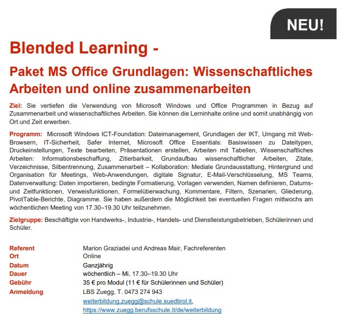 Blended Learning 28.08.2023 | News | Schuljahr 2023/2024 Paket MS Office Grundlagen: Wissenschaftliches Arbeiten und online zusammenarbeiten