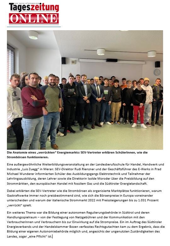 SEV-Vertreter*innen erklären Schüler*innen wie die Strombörsen funktionieren 24.11.2022 | News | Projekte | Schuljahr 2022/2023 https://www.tageszeitung.it/2022/12/06/verrueckter-markt/ Dokumente zum Herunterladen Verrückter Energiemarkt.JPG (104 KB) »