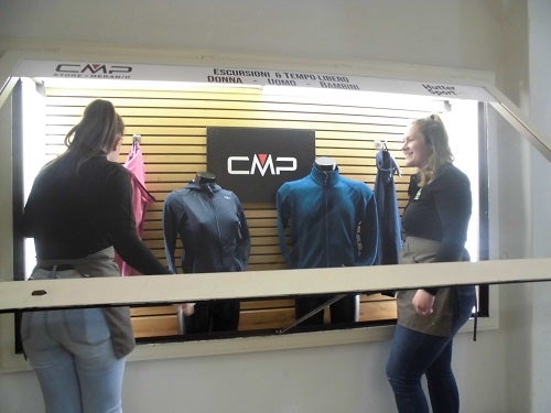 Verkäuferlehrlinge gestalten die Schaufensterauslagen im Betrieb Hutter Sport in Meran